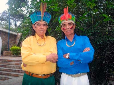 A história de eu dar aulas de violão se espalhou pela cidade, o que me valeu convite para participar de serenatas e, numa destas eu pude comparecer. Estavam a postos a Srª Ata Pais, funcionária da Coletoria, um irmão dela que era escrivão de polícia em Rio Preto e seu colega de coletoria, Arioste Monteiro. Irmão da professora Ariosdene, que foi quem alfabetizou meu filho Ricardo. Dona Ata, que morava numa casa atrás da igreja matriz, tocava flauta muito bem, seu irmão era ótimo violinista, o Arioste tinha voz de cantor lírico; ali também estava a Nely, filha do Sr. Chiquinho de Paula, cuja voz também me impressionou. Completavam o grupo alguns amigos que faziam coro quando cantavam “Las marianitas”, “Las golondrinas” e outros sucessos da época. A seresta em Monte Aprazível apresentava para mim uma novidade, algo que não sucedia nas serestas de Itápolis, onde as pessoas ouviam os seresteiros sem abrir suas janelas, a única manifestação que indicava que estavam ouvindo era que acendiam a luz, que se via pelas frestas. Em Monte Aprazível, nas serestas que eram frequentes, assim que acabava a primeira música, as portas da casa se abriam e os comes e bebes estavam lá, prontinhos para serem servidos, o que mostrava que já esperavam pelos seresteiros. As serestas serviram para eu conhecer os músicos, os cantores e as famílias que nos receberam. Foi assim que eu soubesse que havia um grupo de canto lírico na cidade, do qual Nely e Arioste faziam parte, juntos com Dona Lourdes de Barros e vários outros membros, sob a batuta da competente maestrina Professora Maria Aparecida Rodrigues Pereira, diretora do Conservatório Musical. Por meio deles conheci a Lisete Buissa que era pianista e professora de música em escolas da região. Foi naquela primeira noitada de seresta que conheci um dos melhores amigos que passei a ter na minha nova terra, o Dr. Everaldo Nazareth, em cuja casa entramos e fomos recebidos com a enorme simpatia de Dona Luzia, irmã do já então falecido Professor Raul Vieira Luz; as crianças, Maria Cecília, Belinha, Everaldinho e Marco Antônio dormiam naquela hora. Ali nasceu uma amizade que rendeu muitas histórias e que perdura. Dr. Everaldo era presidente do Aprazível Clube e, com ele, pude realizar programas de arte e cultura que marcaram época. Da casa do Dr. Everaldo fomos para diante da casa do então prefeito Wilson Guiguet Leal, onde fomos recebidos da mesma forma simpática, podendo conhecer Dona Hebe e suas irmãs da família Gimenes. Mais tarde estes encontros propiciaram a extensão da nova amizade entre nossas famílias. A gente cantou na casa do José Ceneviva e de Dona Ruth, na casa do Gino Papa e Dona Amélia, em frente à casa do Sr. Elias Chibebe. Foi uma noitada e tanto. Não perdi mais nenhuma seresta, conhecendo novos futuros amigos, como o Serginho de Oliveira, que tocava violão e cantava com voz suave; o saudoso Adalberto, irmão do relojeiro Sinésio, que depois se casou com a Veras Guariglia, filha do Nicola, na época gerente do Laticínio; também o Julinho Amarante, o João do Pinho, mestre no violão, que saía da padaria do Dimas, onde trabalhava até dez da noite, sentava com seu violão num banco da praça e dedilhava até sonatas de Beethoven e valsas de Chopin. Depois que eu já conhecia o meu grande benfeitor Padre Altamiro, eu participei de serestas com ele também. Padre Altamiro trazia com ele um par de colheres com as quais ele marcava o ritmo. Tinha mais gente, mais instrumentistas, mais cantores, eu ainda vou me lembrar, Ah, preciso dizer que a primeira casa em que cantamos, na minha estreia, foi a do Bepe Maset, que era ali mesmo, na esquina do Largo da Matriz, onde havíamos marcado o encontro. O Bepe estava eufórico e até cantou o “Torna Sorrento” e “O sole mio”, acompanhado de Dona Yvone Cury, sua esposa. Estou escrevendo e estou vendo estas pessoas diante de meus olhos e ouvindo suas vozes cantarolando em momentos felizes. Era a minha integração passo a passo com minha nova gente. Espero que minha memória me ajude a lembrar de todos, de seus traços, de suas vozes, de suas histórias.  | | Célebre dupla caipira Cacique e Pajé, exportação de Monte Aprazível | Daí por diante eu me misturei de vez com esta gente ótima, vi as catiras maravilhosas na casa do Nhô Marcolino e Madrinha Lódia, com os shows do Moacir Catireiro junto com os irmãozinhos do Alvarenga, lá na antiga saída de Neves; vi a excelente Companhia de Reis do Sebastião Mineiro, com o Marinho Honório na rabeca, o Nego (Ermelindo Domingues) puxando as sete notas com as vozes da familiagem do puxador Tião Mineiro. Eu até gravei uma “chegada” de Reis na Sede Pio XII, ainda com um gravadorzinho de fita, que uma noite o Adalberto pediu emprestado para mostrar para seus vizinhos, mas, na verdade, o que ele fez, foi entrar com ele no cemitério, acionar para tocar a cantoria no volume mais alto, só para assustar a vizinhança; aquela fita foi parar na França, pelas mãos do Monsieur Bodet, que se apaixonou por ela quando de uma de suas visitas à nossa Aliança Francesa. Minha integração com a comunidade caipira se completou quando passei a cortar o cabelo com o Alvarenga, num salão ali na Praça da Igreja; ele tocava uma viola como poucos e fazia dupla com seu irmão, cantando na Rádio Difusora com o nome de “Peixinho e Peixoto”. Gostei tanto do toque de viola do Alvarenga que lhe dei de presente uma legítima viola dos Vieira de Novo Horizonte, que eu tocava quando fazia trio com o Edson Guiducci e o Bebedouro lá na Faculdade de Rio Preto. Esta viola ele guarda até hoje. Só que agora o Alvarenga não é mais barbeiro, ele é o Cacique, da célebre dupla Cacique e Pajé, exportação de Monte Aprazível. |